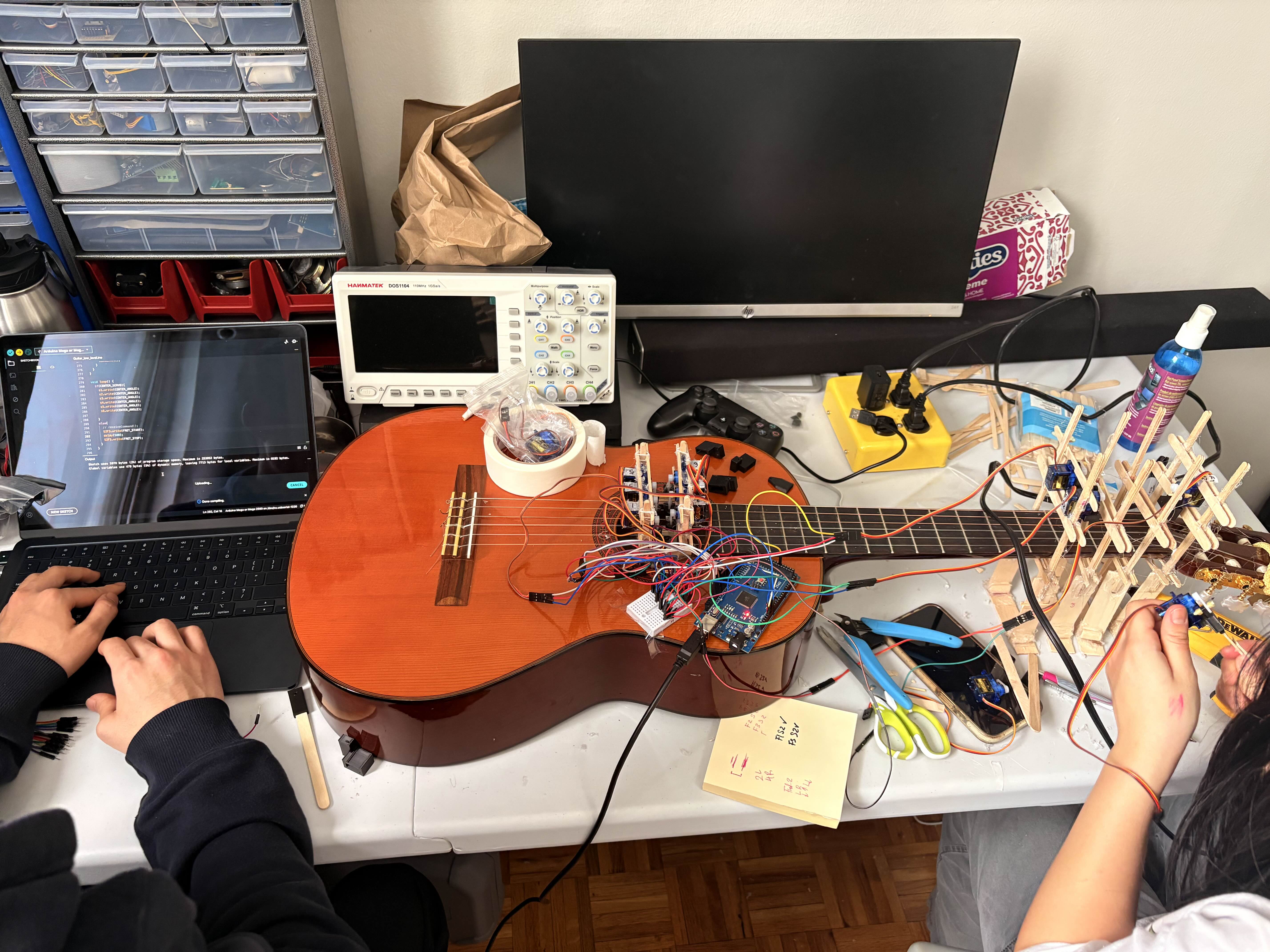Self-playing guitar. First Hackathon, Top 5 finalist.